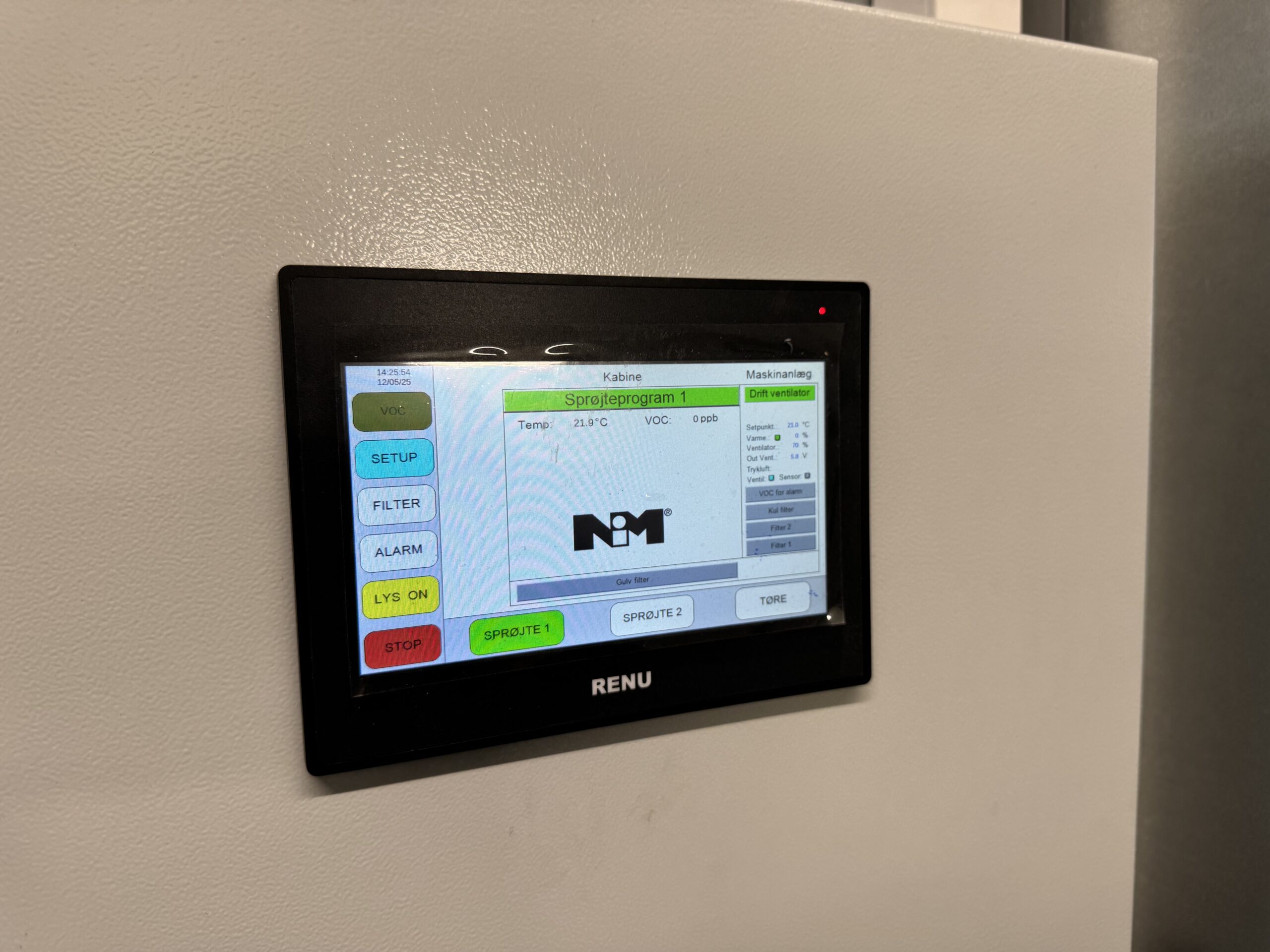 Derudover er den monteret med vores system som reducere voc udledning, der sidder voc måler i maskinanlægget og udleder 0%. samtidig er den opvarmet via el og derfor er denne kabine 100% co2 neutral og 0 emission.